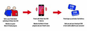 We have one of the best Refer-A-Friend programs around. Refer-A-Friend is one of our premier incentive programs that gives our customers the opportunity to earn fuel credits whenever they refer a friend or family member to Palmer Gas & Oil.  As a residential customer, if you refer a neighbor, family member, or co-worker to become a new Palmer Gas & Oil fuel heating customer, both you AND your friend will receive a credit on your account up to $150!